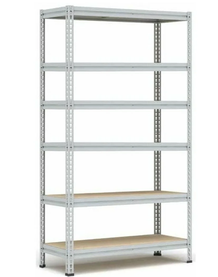 Металлический среднегрузовой стеллаж для склада с настилом из фанеры. Нагрузка на ярус до 300 кг. Быстросборная конструкция (на зацепах).