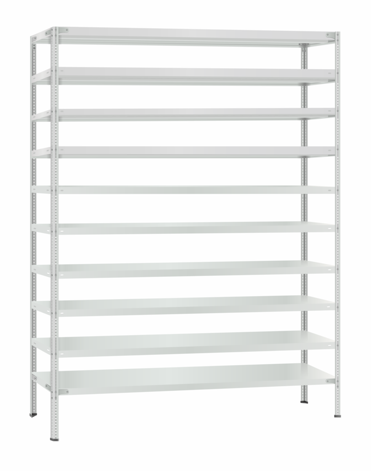 Полки МС Титан изготовлены из высокопрочной стали, покрыта полимерным порошковым покрытием светло серого цвета RAL 7035 типа шагрень
